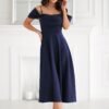 An elegant navy blue midi dress. Draped top with falling sleeves and thin straps accentuate the feminine style, while the flared bottom adds lightness. The dress is fastened with a concealed zipper.