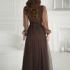 Beautiful long dress, extremely graceful, made of flowing fabric. The top with a delicate neckline, the bottom is two-layered with a slit on the leg, adding charm to the creation. The dress fastens with a concealed zipper. A belt is included with the dress. Available in trendy colors.